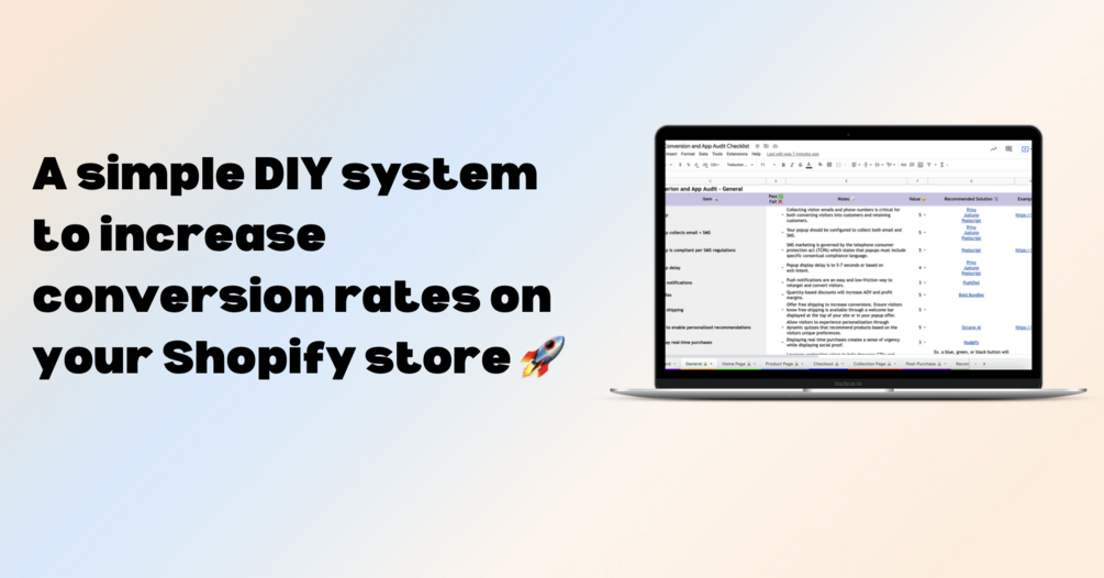 Get an actionable Shopify conversion optimization and app audit template. Designed to help you increase conversion rates and make more money. 30-day money back guarantee.